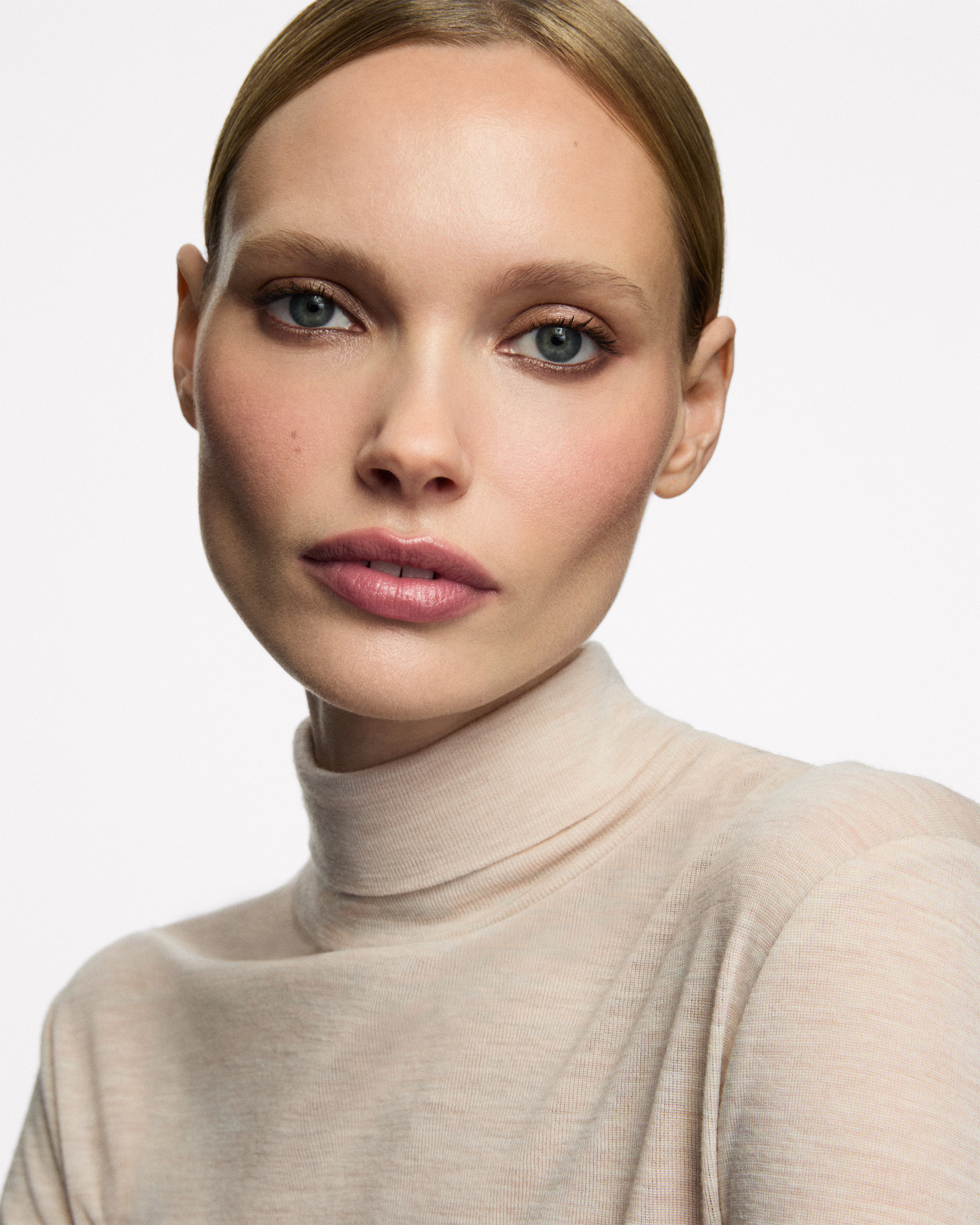 Trage das Rouge mit dem 64G-Pinsel mit lockerem Haar auf die Wangen auf. Arbeite in Schichten und bewege den Pinsel in Richtung der Schläfen, um die gewünschte Farbintensität allmählich aufzubauen.