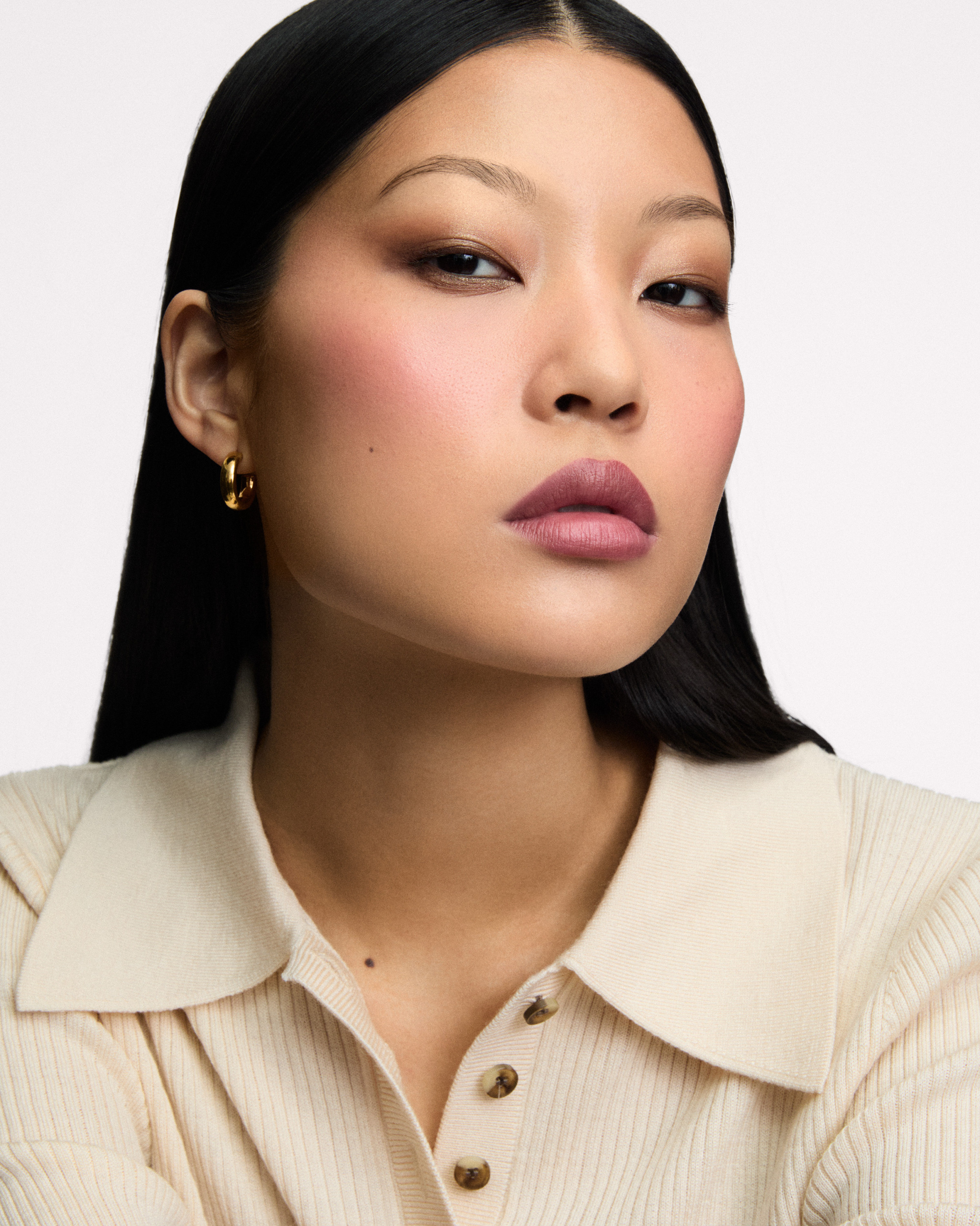 Trage das Rouge mit dem 64G-Pinsel mit lockerem Haar auf die Wangen auf. Arbeite in Schichten und bewege den Pinsel in Richtung der Schläfen, um die gewünschte Farbintensität allmählich aufzubauen.