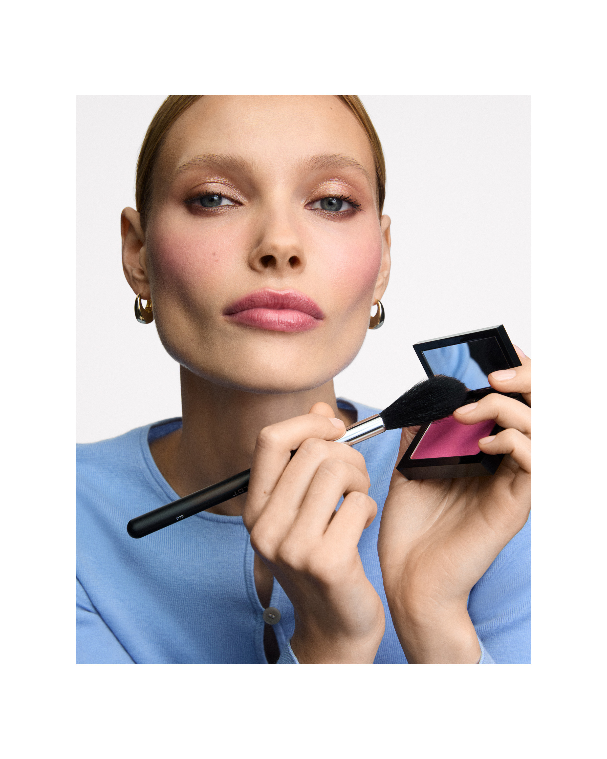 Apply blush to the cheeks using the 64G brush with loose bristles. Build up the colour gradually, moving the brush toward the temples and layering the product to achieve the desired effect.