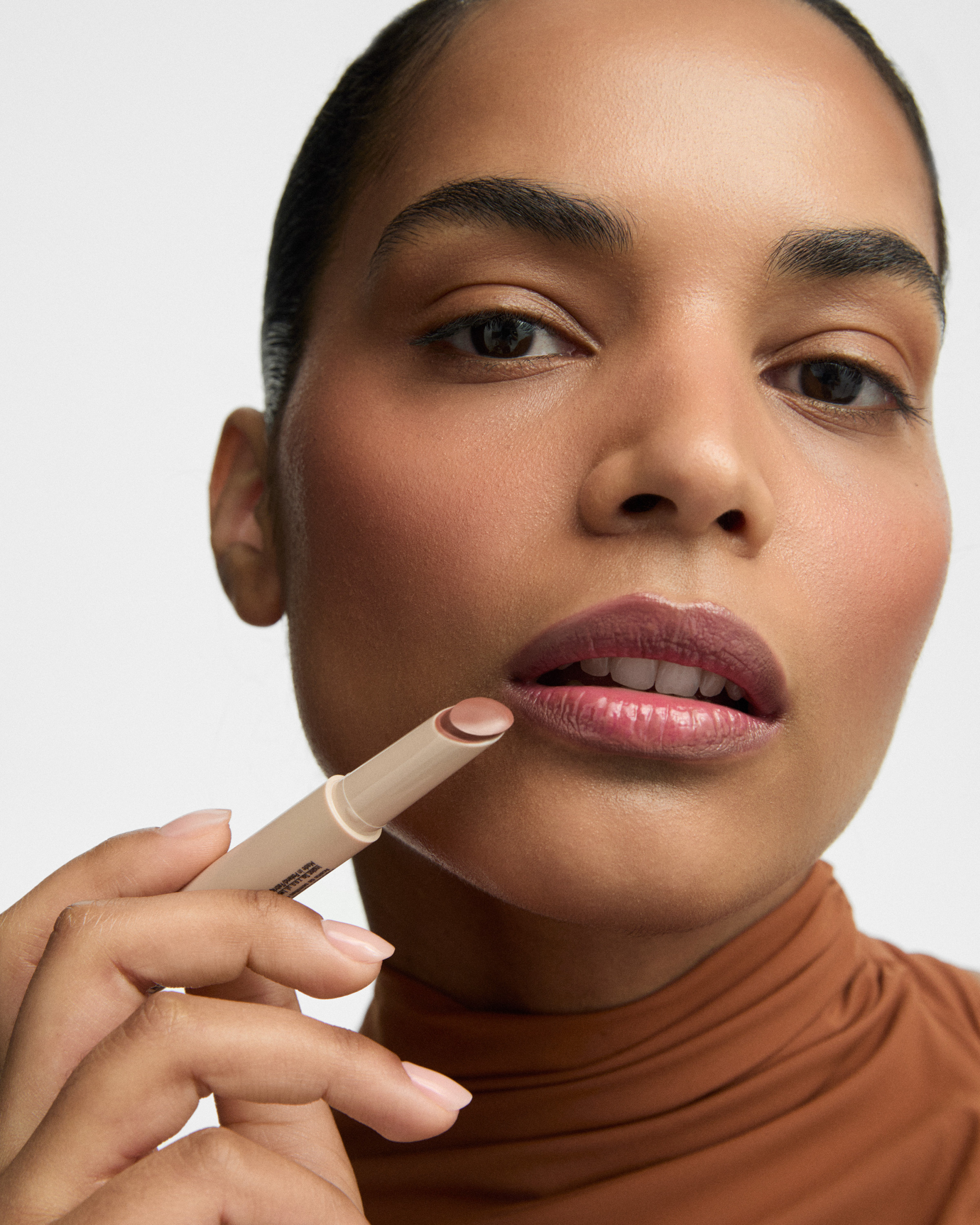 1. Outline the lips with a lip liner and gently blend it with your fingertip to create a soft transition. Then apply Lip Volume Tinted Lip Balm, focusing the colour on the centre of the lips and softly tapping it in. This technique creates the on-trend cloud lips effect.